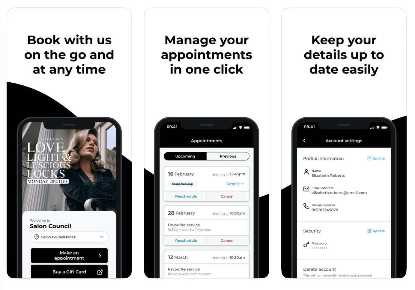 Book your next appointment 24/7 | Meet our team and choose your favorite stylist | Register & manage your account | Keep a record of your appointments | View promotions & salon updates | Buy gift cards + view loyalty rewards | Quick access to both locations | And more!
