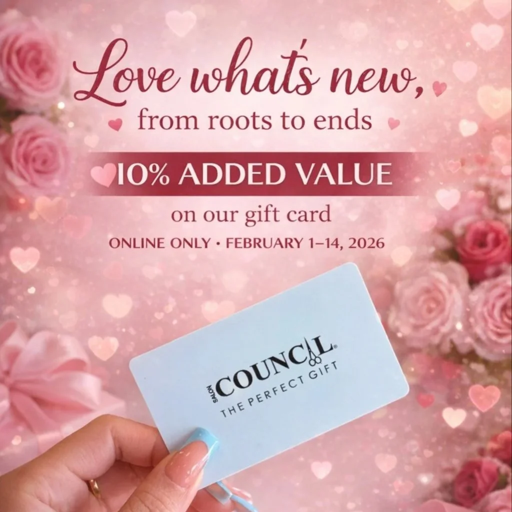 This Valentine’s season, Salon Council is making it even more special to give the gift of great hair. From February 1 to February 14, 2026, we’re offering a 10% added value on all gift cards purchased online—our way of saying thank you for choosing to celebrate love with us.